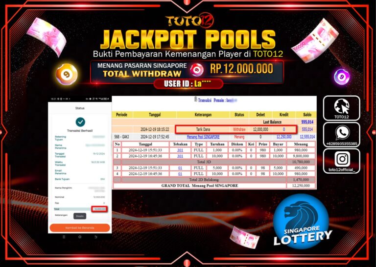 Selamat kepada Member Kami La**** Telah Jackpot dan berhasil mendapatkan kemenangan besar pada permainan JACKPOT POOLS PASARAN (SINGAPORE) Dengan Kemenangan Sebesar Rp.12.000.000 –. Setelah mengisi Fomulir Withdraw dengan Kurang waktu 1-2 Menit Dana sudah kami Trasnfer kepada Pemilik Userid dan dana sudah dapat di cairkan oleh pemenang. Bukti Pembayaran yang TOTO12 berikan merupakan Bukti Pembayaran yang …