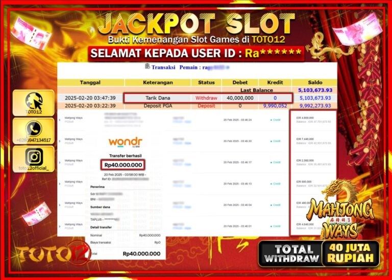 Selamat kepada Member Kami Ra****** Telah Jackpot dan berhasil mendapatkan kemenangan besar pada permainan JACKPOT SLOT GAME (MAHJONG WAYS) Dengan Kemenangan Sebesar Rp.40.000.000 –. Setelah mengisi Fomulir Withdraw dengan Kurang waktu 1-2 Menit Dana sudah kami Trasnfer kepada Pemilik Userid dan dana sudah dapat di cairkan oleh pemenang. Bukti Pembayaran yang TOTO12 berikan merupakan Bukti Pembayaran…