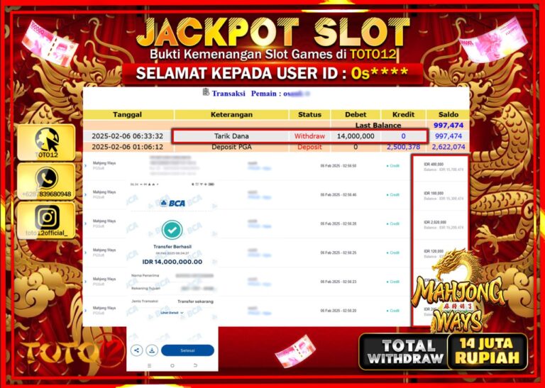 Selamat kepada Member Kami Os***** Telah Jackpot dan berhasil mendapatkan kemenangan besar pada permainan JACKPOT SLOT GAME (MAHJONG WAYS) Dengan Kemenangan Sebesar Rp.14.000.000 –. Setelah mengisi Fomulir Withdraw dengan Kurang waktu 1-2 Menit Dana sudah kami Trasnfer kepada Pemilik Userid dan dana sudah dapat di cairkan oleh pemenang. Bukti Pembayaran yang TOTO12 berikan merupakan Bukti Pembayaran…