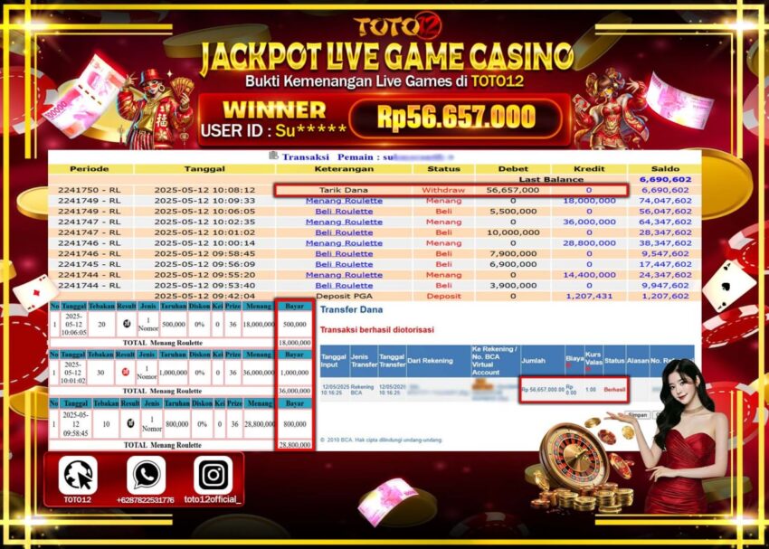 Selamat kepada Member Kami Si****** Telah Jackpot dan berhasil mendapatkan kemenangan besar pada permainan JACKPOT LIVE GAMES CASINO (ROULETTE) Dengan Kemenangan Sebesar Rp.56.657.000 –. Setelah mengisi Fomulir Withdraw dengan Kurang waktu 1-2 Menit Dana sudah kami Trasnfer kepada Pemilik Userid dan dana sudah dapat di cairkan oleh pemenang. Bukti Pembayaran yang TOTO12 berikan merupakan Bukti Pembayaran yang SAH / VALID yang langsung Di dapatkan melalui transaksi dari Bank yang di Tunju.