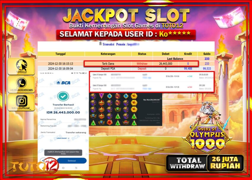 Selamat kepada Member Kami Ko***** Telah Jackpot dan berhasil mendapatkan kemenangan besar pada permainan JACKPOT SLOT GAME (GATES OF OLYMPUS 1000)  Dengan Kemenangan Sebesar Rp.26.000.000 –.  Setelah mengisi Fomulir Withdraw dengan Kurang waktu 1-2 Menit Dana sudah kami Trasnfer kepada Pemilik Userid dan dana sudah dapat di cairkan oleh pemenang. Bukti Pembayaran yang TOTO12 berikan merupakan Bukti Pembayaran yang  SAH / VALID yang langsung Di dapatkan melalui transaksi dari Bank yang di Tunju.