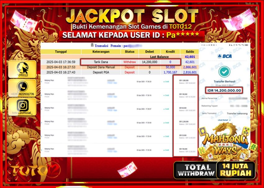 Selamat kepada Member Kami Pa***** Telah Jackpot dan berhasil mendapatkan kemenangan besar pada permainan JACKPOT SLOT GAME (MAHJONG WAYS) Dengan Kemenangan Sebesar Rp.14.000.000–. Setelah mengisi Fomulir Withdraw dengan Kurang waktu 1-2 Menit Dana sudah kami Trasnfer kepada Pemilik Userid dan dana sudah dapat di cairkan oleh pemenang. Bukti Pembayaran yang TOTO12 berikan merupakan Bukti Pembayaran yang SAH / VALID yang langsung Di dapatkan melalui transaksi dari Bank yang di Tunju.