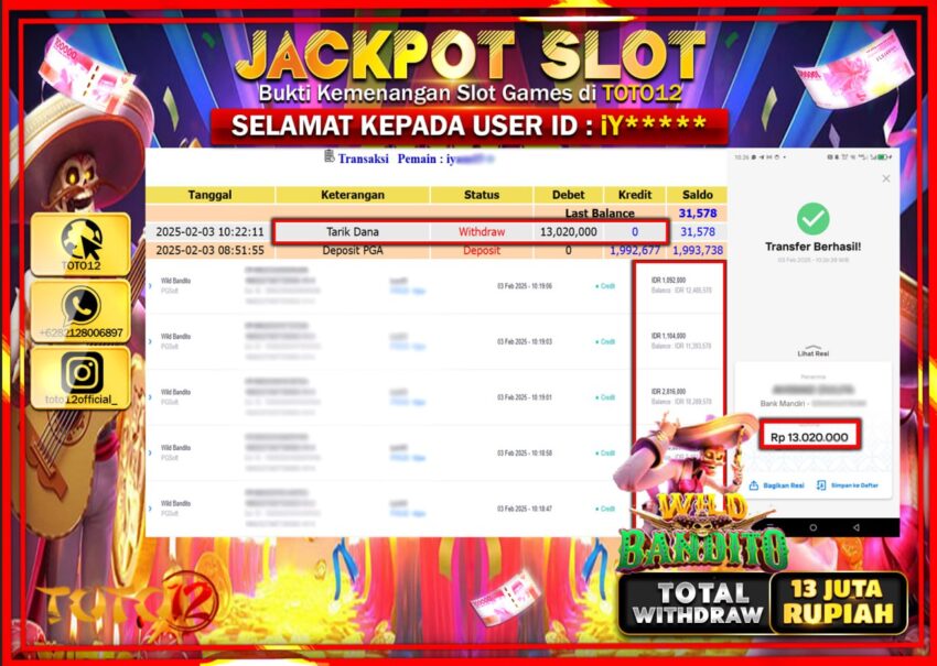 Selamat kepada Member Kami iY***** Telah Jackpot dan berhasil mendapatkan kemenangan besar pada permainan JACKPOT SLOT GAME (WILD BANDITO)  Dengan Kemenangan Sebesar Rp.13.020.000 –.  Setelah mengisi Fomulir Withdraw dengan Kurang waktu 1-2 Menit Dana sudah kami Trasnfer kepada Pemilik Userid dan dana sudah dapat di cairkan oleh pemenang. Bukti Pembayaran yang TOTO12 berikan merupakan Bukti Pembayaran yang  SAH / VALID yang langsung Di dapatkan melalui transaksi dari Bank yang di Tunju.