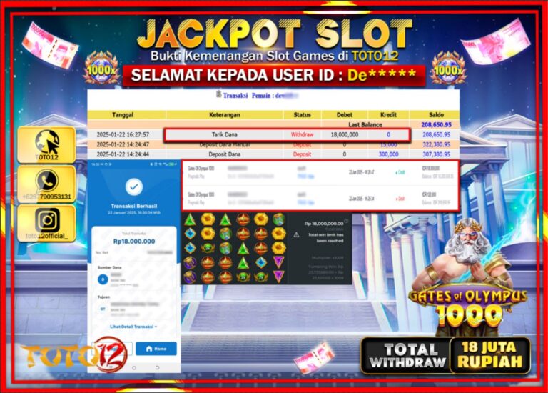 Selamat kepada Member Kami Fl***** Telah Jackpot dan berhasil mendapatkan kemenangan besar pada permainan JACKPOT SLOT GAME (THE DOG HOUSE) Dengan Kemenangan Sebesar Rp.18.000.000 –. Setelah mengisi Fomulir Withdraw dengan Kurang waktu 1-2 Menit Dana sudah kami Trasnfer kepada Pemilik Userid dan dana sudah dapat di cairkan oleh pemenang. Bukti Pembayaran yang TOTO12 berikan merupakan Bukti…
