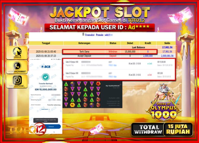 Selamat kepada Member Kami Ad***** Telah Jackpot dan berhasil mendapatkan kemenangan besar pada permainan JACKPOT SLOT GAME (SLOT MANIA SUGAR) Dengan Kemenangan Sebesar Rp.17.000.000 –. Setelah mengisi Fomulir Withdraw dengan Kurang waktu 1-2 Menit Dana sudah kami Trasnfer kepada Pemilik Userid dan dana sudah dapat di cairkan oleh pemenang. Bukti Pembayaran yang TOTO12 berikan merupakan Bukti…